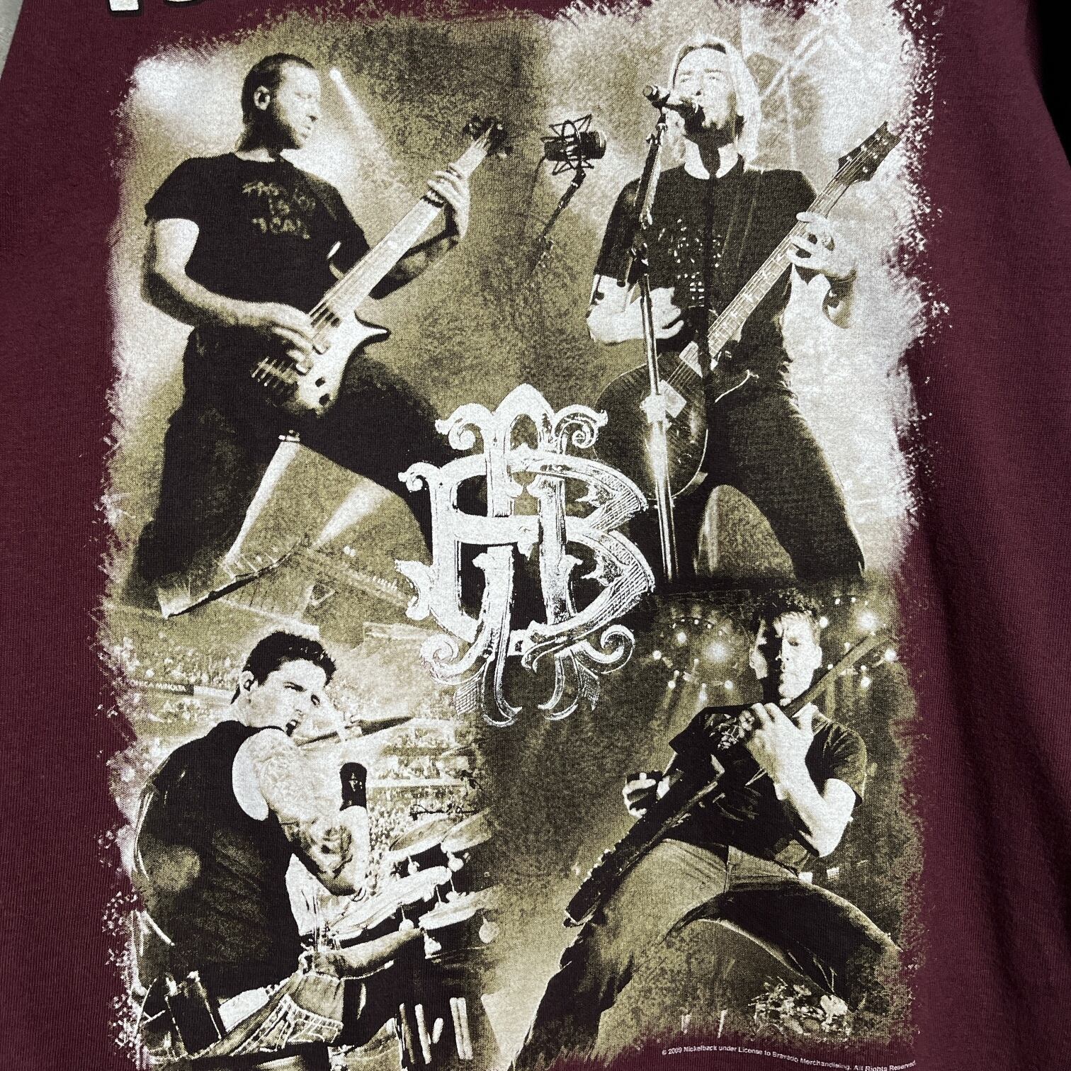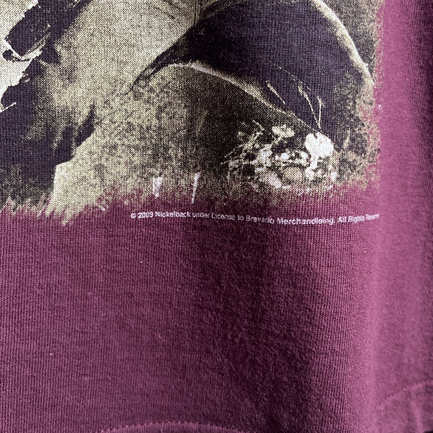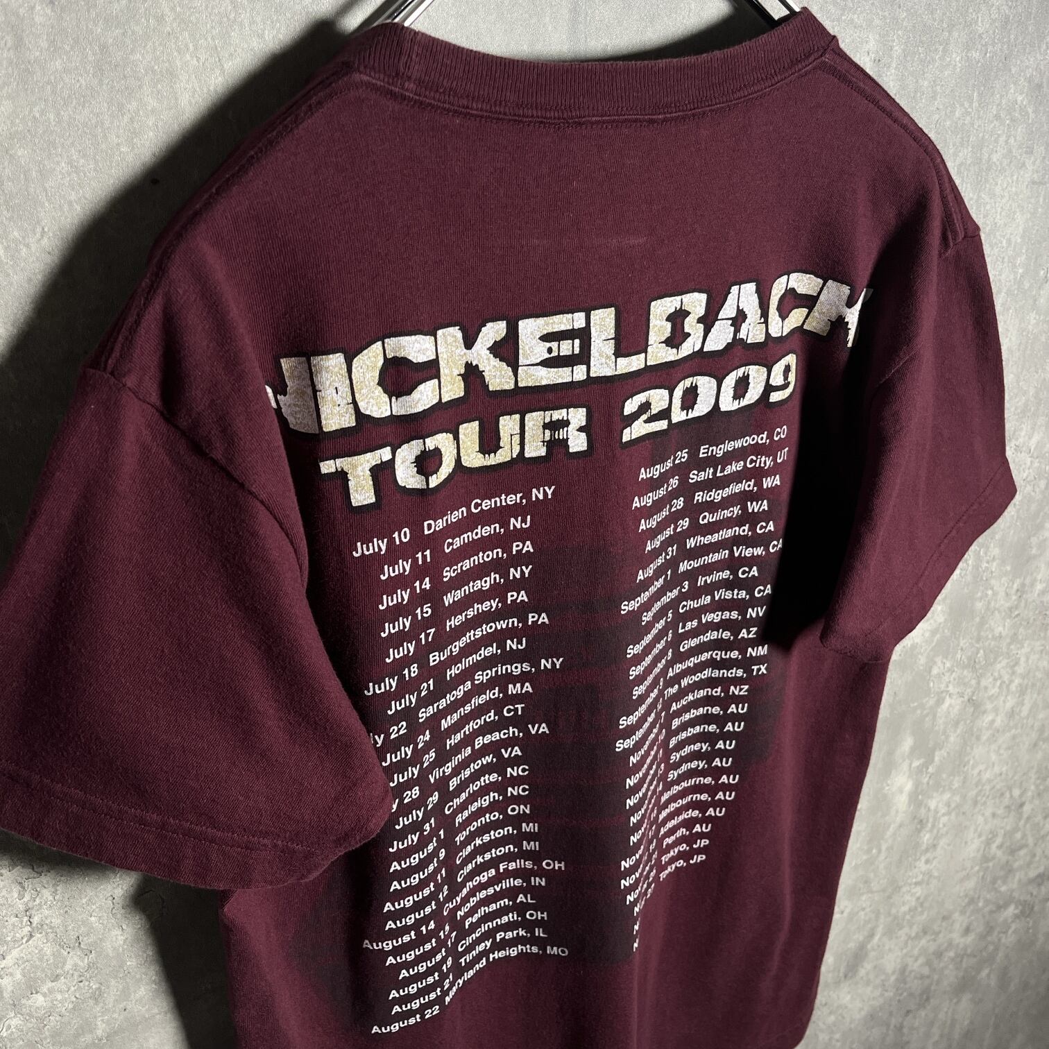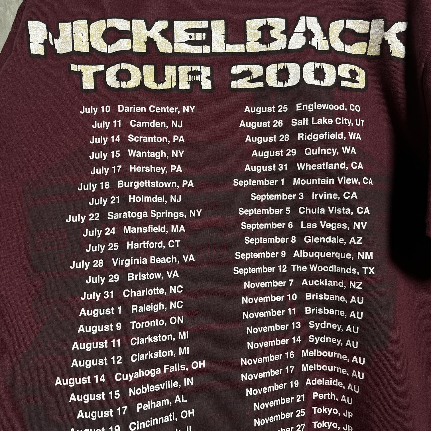 ▶︎カナダ発ロックバンドNickelbackの2009年ワールドツアー時に販売されたオフィシャルTシャツです。フロントにはライブ中のメンバー写真が大胆にプリントされ、バックには全ツアー日程と都市が記載されたクラシックなバンドTデザイン。深みのあるバーガンディカラーが、00年代特有の雰囲気を演出しています。