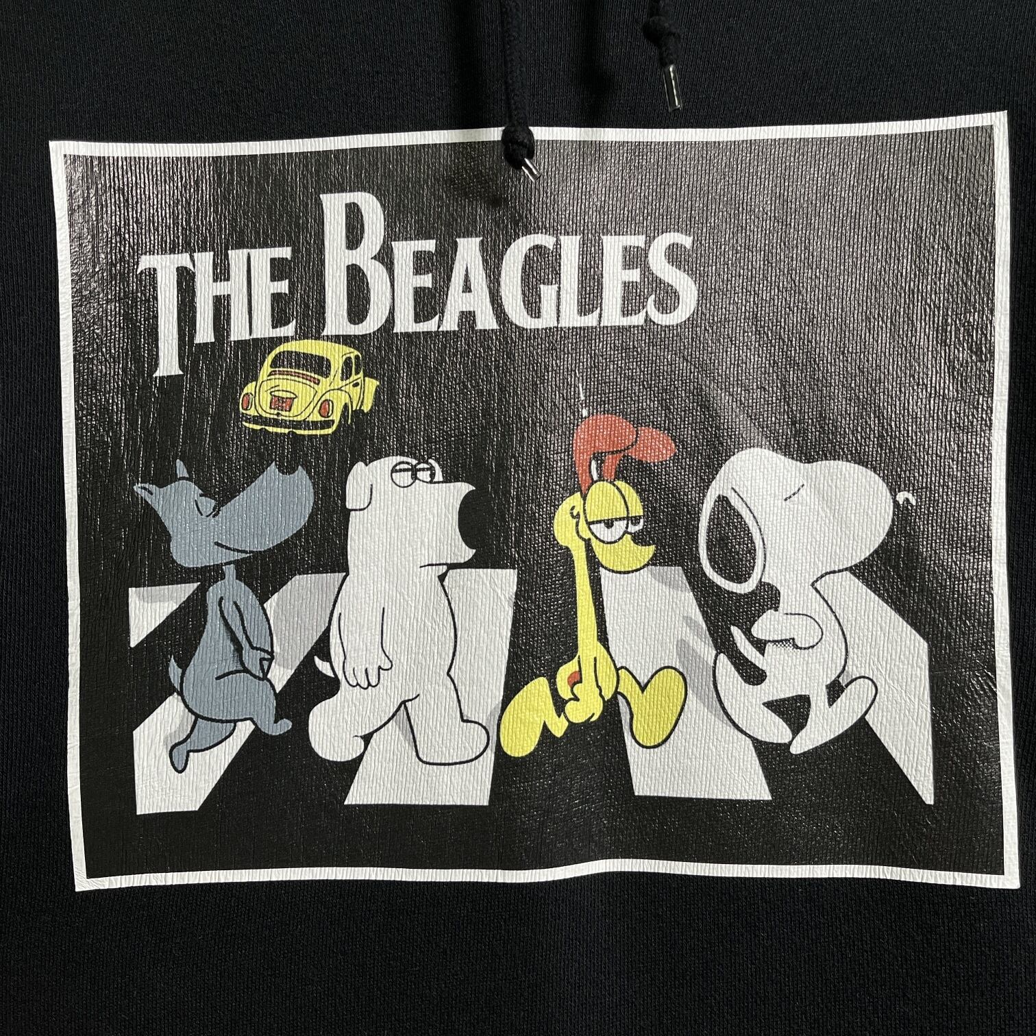 ▶︎ビートルズの名盤「Abbey Road」をモチーフに、人気キャラクター風のビーグルたちが横断歩道を渡るユニークなパロディデザイン。